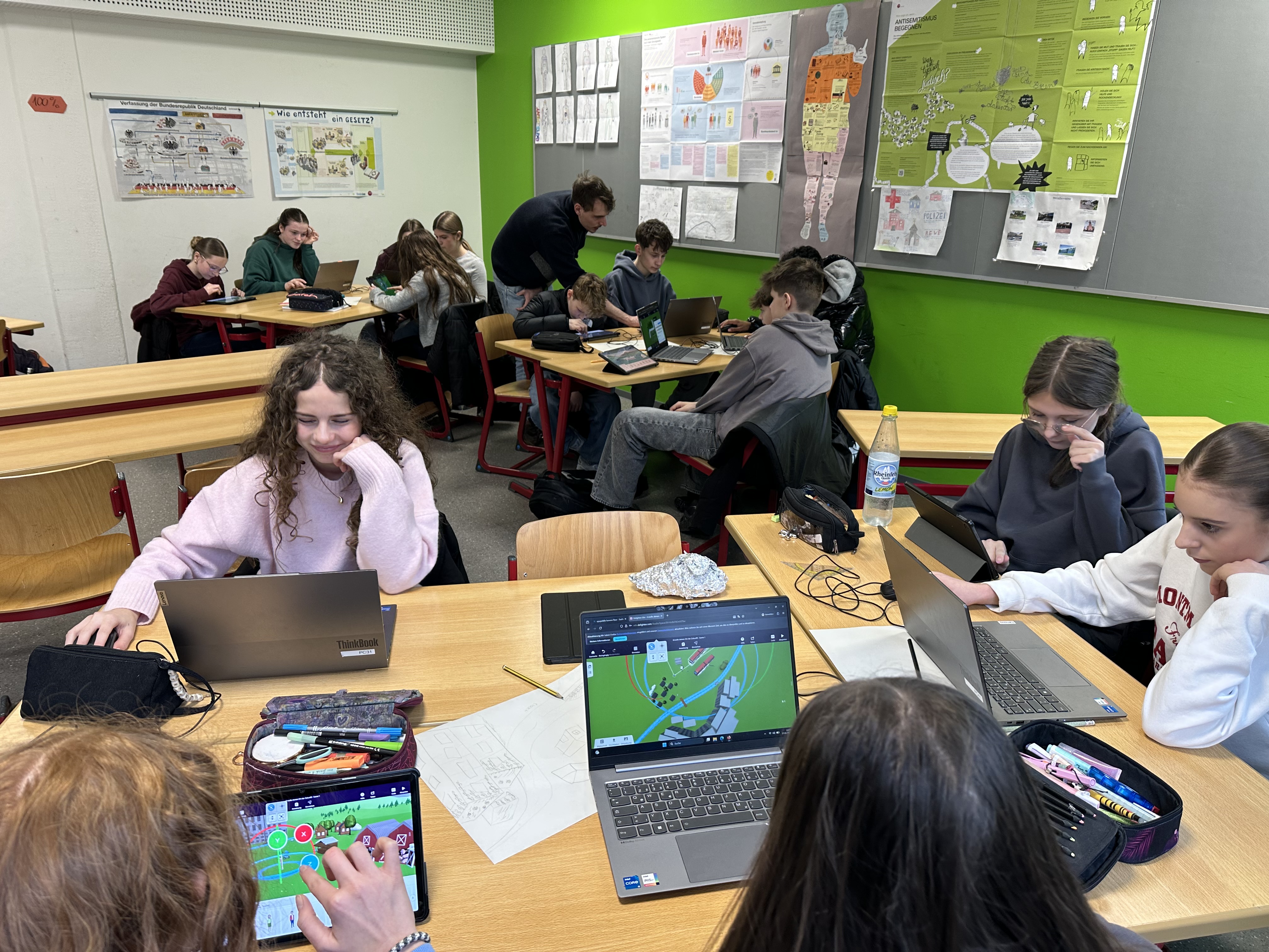 Eine Woche lang fanden an unserer Schule durchgehend drei Workshops parallel statt. Die Schülerinnen und Schüler aller Unter- und Mittelstufenklassen setzten sich dabei mit verschiedenen Aspekten der Zukunft auseinander. Dazu gehörten unter anderem Robotik, das kreative Gestalten digitaler Welten, die mit VR-Brillen erlebt werden konnten, sowie die Auseinandersetzung mit zukünftigen Berufsfeldern und ersten Programmiererfahrungen.
